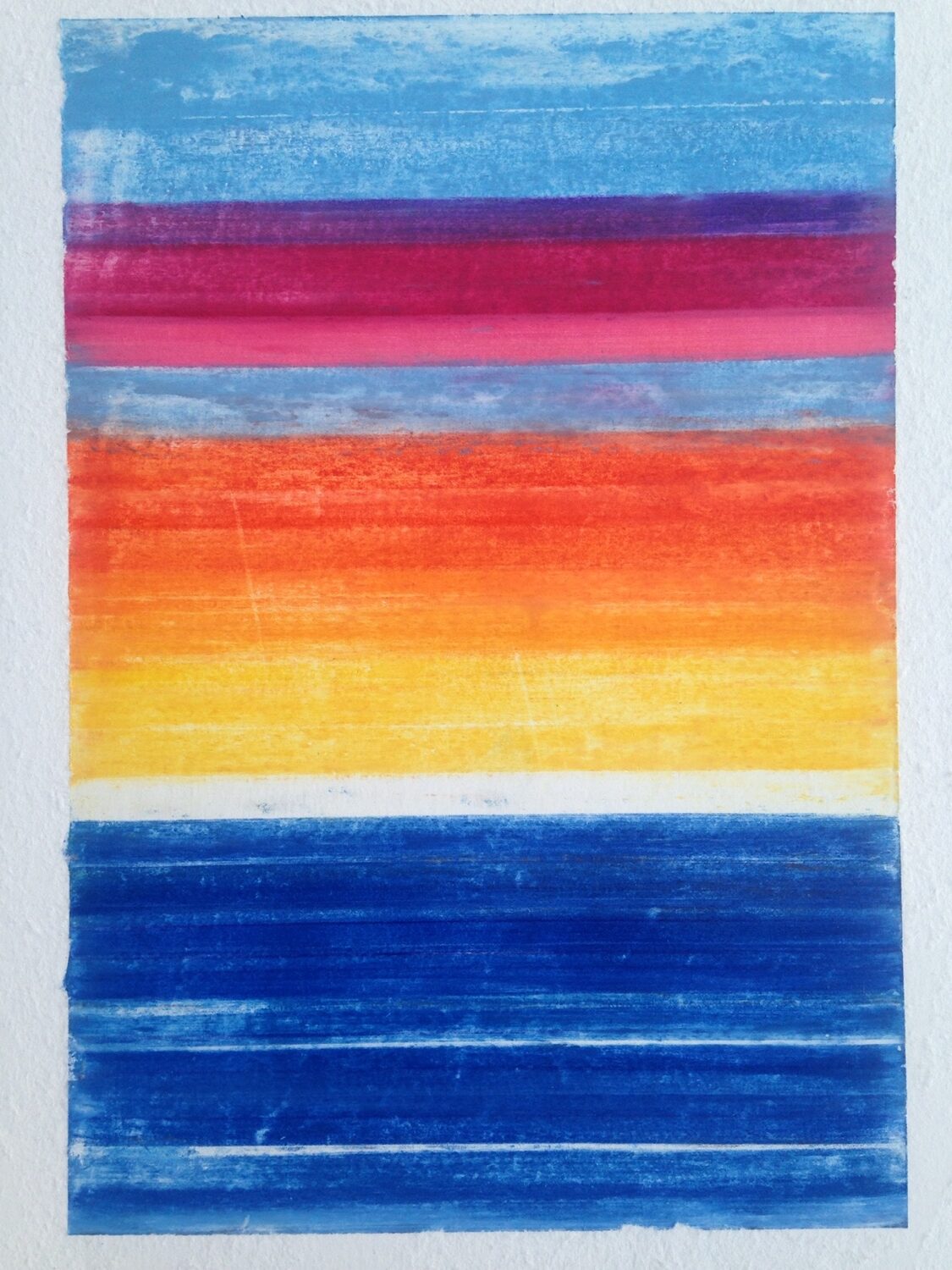 Grew up drawing and painting, wrote first poem at age ten and pursued the literary arts, all the while practicing the visual arts secondarily. Started studio/gallery in Santa Barbara’s Funk Zone and maintained it for almost fifteen years, where I came to realize that what we all want from art is to be temporarily arrested by something floating and glowing; thus, all my work must float and glow. Some years ago I put focus on the drawn abstraction, or scribble, where I consciously place focus on it, rather than deploy it as a motif. My colorfield works are primarily monotypes, though continue to use all mediums, and continuously endeavor to find new ways of using age-old materials.