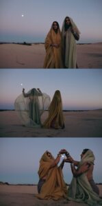 Each work consists of one 16 x 24 in archival pigment print mounted to lightweight foam board and installed as a floating triptych photograph. The panels are suspended approximately 1–2 inches from the wall using fishing wire or fabric ties. Fabric elements will be lightly draped and tacked directly to the wall behind the prints to create texture and dimensional depth as part of the installation.