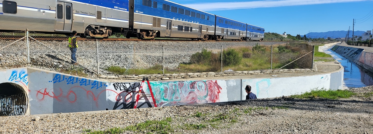 The Moon Ditch Flood Control Channel is an iconic location for urban art within Ventura County. Located off Highway 101 in Ventura, the channel stretches for over a mile near the Ventura Auto Center. The concrete slope of the ditch is visible from both the freeway and the rail-line. Over 130,000 commuters, workers and tourists pass the Moon Ditch every day. Though it may only be visible for brief moments if driving by, the concrete walls with their mismatch tags and graffiti make a considerable impression.